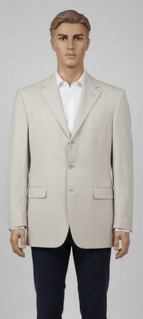 Bej renkte, düğmeli ve klasik yakalı erkek ofis ceketi. Normal boy ve uzun kolludur, iş ortamı için uygundur.