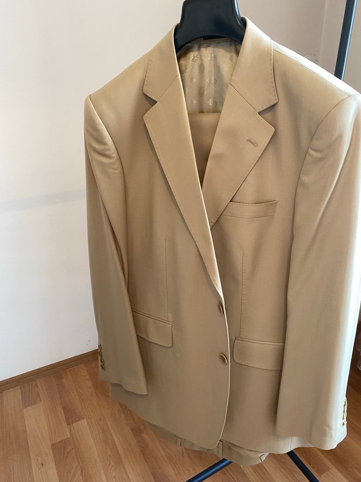 Bej renkli, düğmeli ön kısmı ve klasik yaka detaylı erkek takım elbisesi. Normal kesim, uzun kollu, parlak dokusu ile modern klasik tarzda ofis kullanımı için uygun.