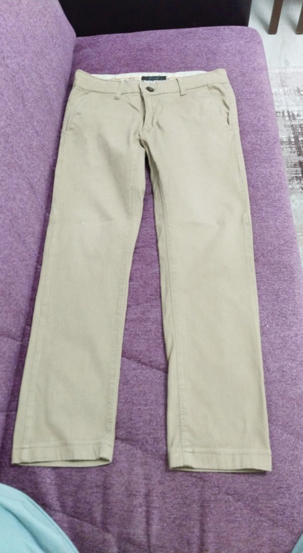 Düğmeli, bej renkte, sentetik kumaştan yapılmış, normal boyda ve düz kesim erkek pantolon. Günlük kullanıma uygundur.