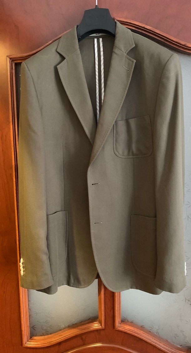 Bej renkli, düğmeli erkek takım ceketi. Notlu yaka ve uzun kollu, klasik modern tarzda, ofis için uygun.kuru temizlemeye gönderdik ,geldiğinde arka sırt kısmında renk değişimi olmuştu ,resimde görünüyor