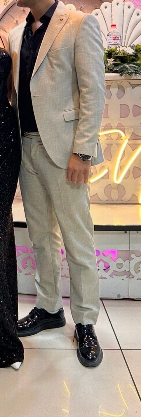 Düğmeli, bej renkli erkek takım elbisesi, normal boy midi kesim ve uzun kolludur. Ofis ve günlük sokak stiline uygundur. Yalnızca bir kere giyilmiştir.