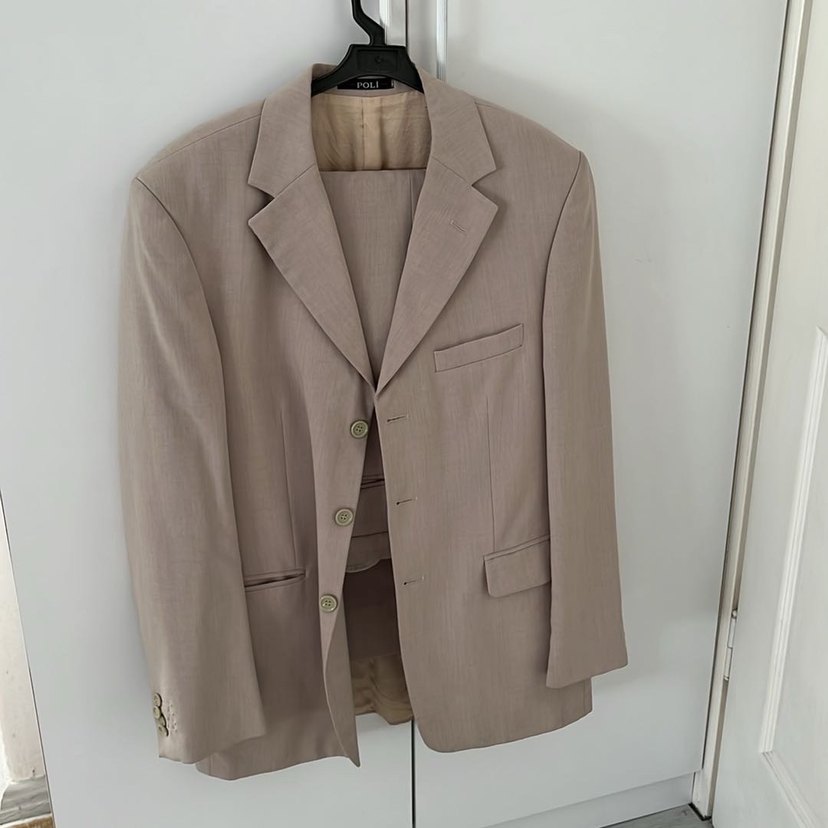 Bej renkli, düğmeli ve klasik yaka detaylı erkek takım elbise ceketi ve pantolonu Uzun kollu ve düzenli kesimle ofis kullanımı için uygundur.