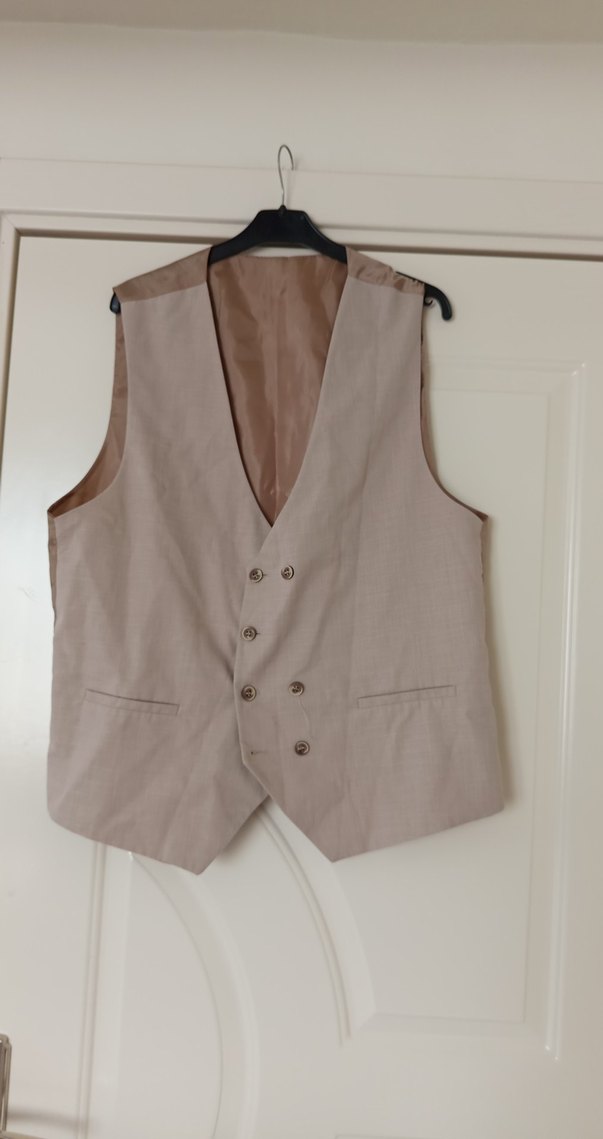 Bej renkte, düğmeli, yakalı ve kolsuz erkek yeleği. Normal boy ve regular fit kesimle iş ortamına uygundur.