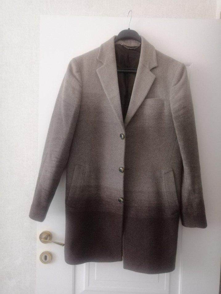 Düğmeli, yün kumaştan yapılmış, bej tonlarında degrade renkli erkek kaban. Normal kesim ve midi boyda, ofis kullanımı için uygundur.