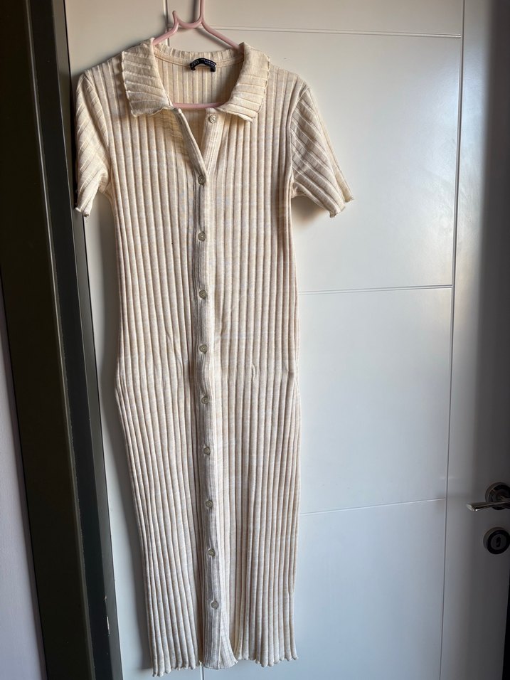 Bej renkte, kısa kollu, yakalı ve düğmeli fitilli triko uzun elbisedir. Pastel tonlarda, desensiz ve günlük kullanıma uygundur.