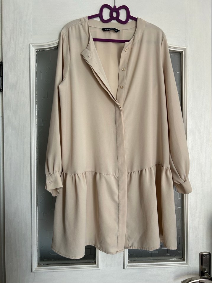 Pastel bej renginde, uzun kollu, düğmeli ve notlu yakalı, rahat kesim hamile midi bluz. Yumuşak keten kumaştan, günlük kullanıma uygun.
