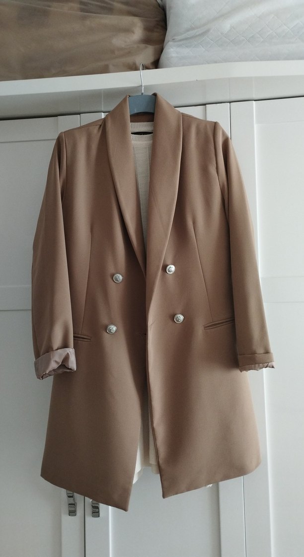Bej renkli, düğmeli ve yakalı kadın blazer ceket, ipeksi kumaştan, normal kesim ve uzun kolludur. Ofis için klasik ve zarif bir görünüme sahiptir.