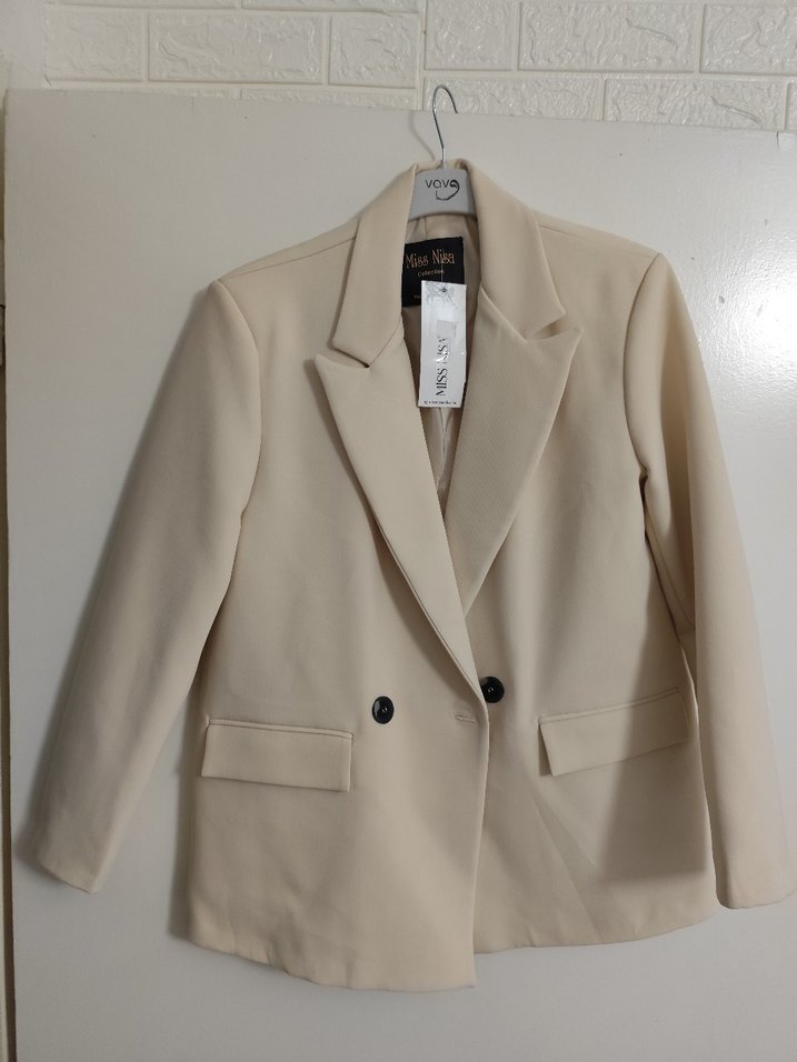 Bej renk, düğmeli, notched lapel yakalı kadın blazer ceket. Regular fit, uzun kollu ve midi boyda, ofis ve günlük kullanıma uygun. Sentetik kumaştan yapılmıştır. ✨