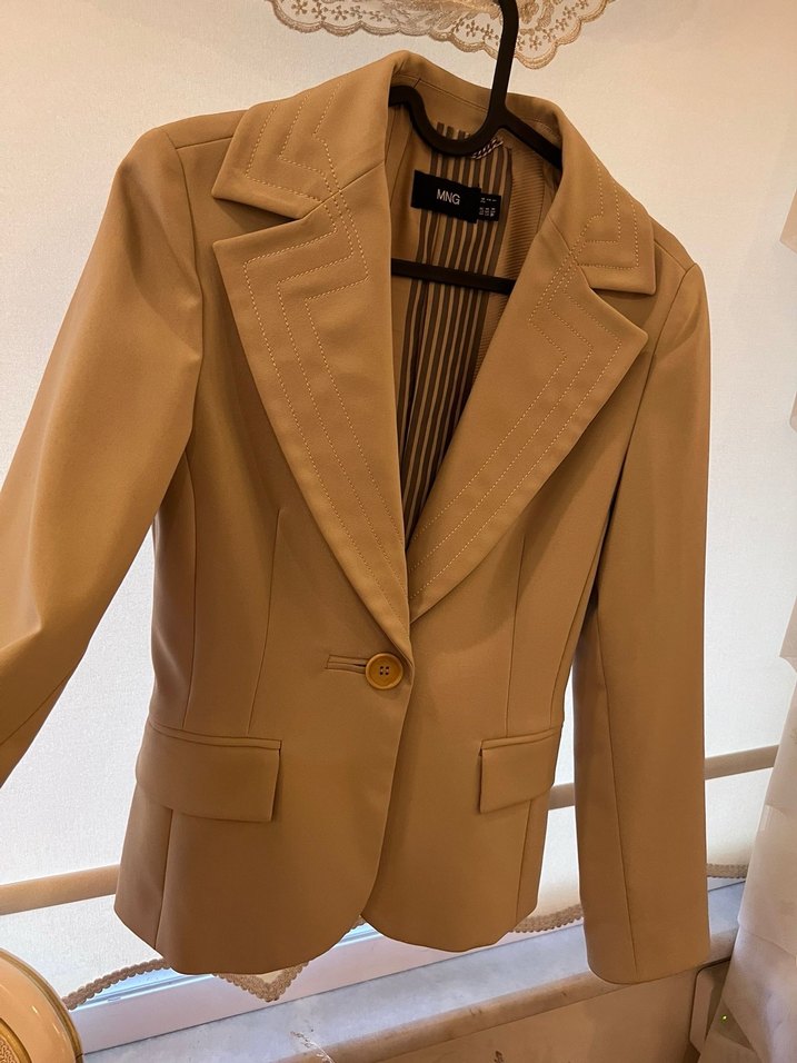 Düğmeli, bej renkli, normal kesim kadın blazer ceket. İpek gibi parlak kumaştan, ofis için uygun, modern klasik tarzda.