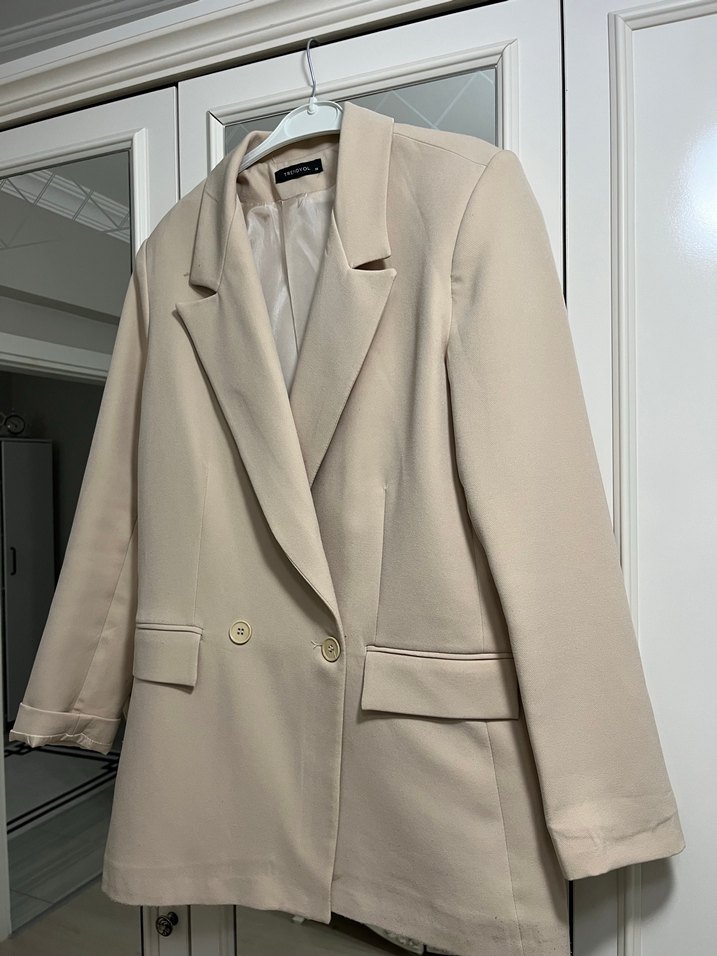 Bej renginde, düğmeli, normal uzunlukta midi kesim kadın blazer ceket. Notch yaka ve uzun kolludur, sentetik kumaştan yapılmıştır. Ofis için uygundur ve modern klasik tarzdadır.