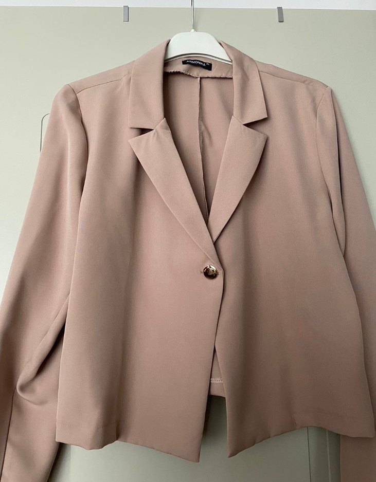 Bej renkte, düğmeli, yakalı ve uzun kollu kadın blazer ceket. İpeksi kumaştan, midi boyda ve normal kesimde, iş ve günlük kullanıma uygun.