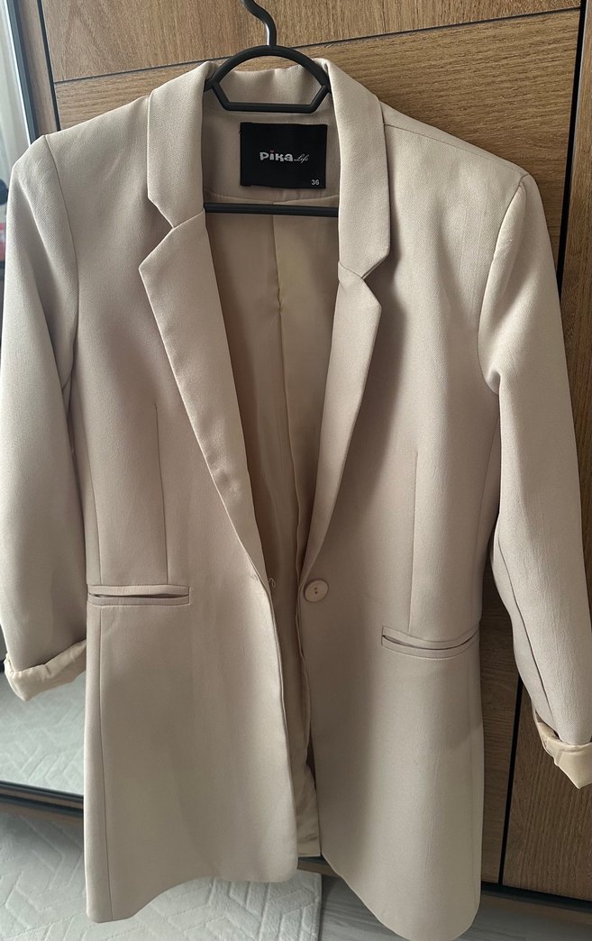 Bej renkli, düğmeli, normal boyda kadın blazer ceket. Uzun kollu ve satenimsi dokusuyla ofis kullanımı için uygundur.