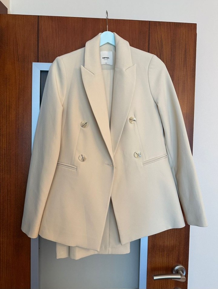 Bej Düğmeli Kadın Blazer Ceket pantolon takım