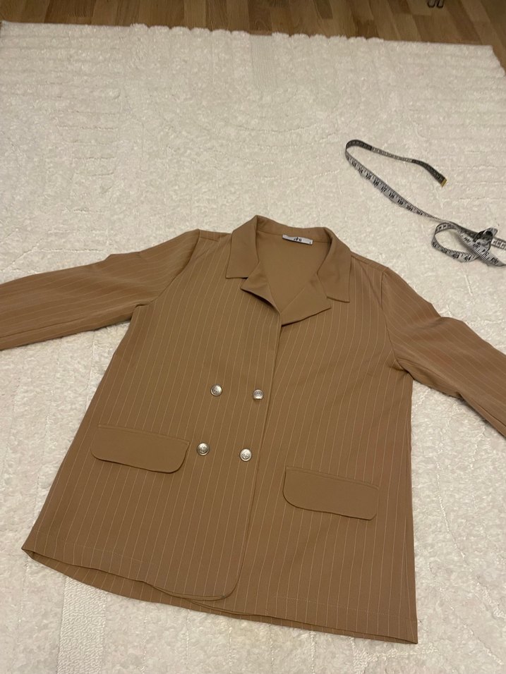 Bej renkli, düğmeli kadın blazer ceket parlak görünüme sahip. Normal boy midi uzunlukta, uzun kollu ve regular fit kesimdir. Sentetik kumaştan üretilmiş, desen içermez. Ön kısmında boya lekesi vardı hiç yıkamadım. Onlar haricinde hiçbir sorunu yoktur tüm ölçüler fotoğraflarda mevcut