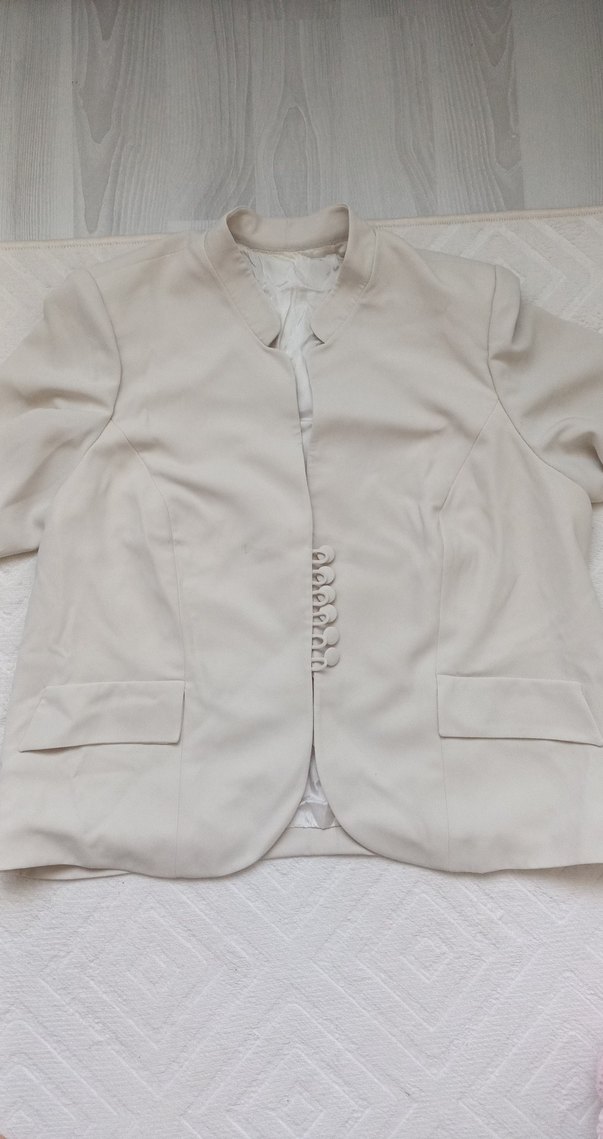 42-44 bedene uygun Bej renkte, düğmeli ön kapamalı, bilekten 3 4 cm kısa tam uzun kollu değil. normal midi boyda, klasik ve şık ofis stiline uygun.Astarlı. Minik lekesi var ekledim