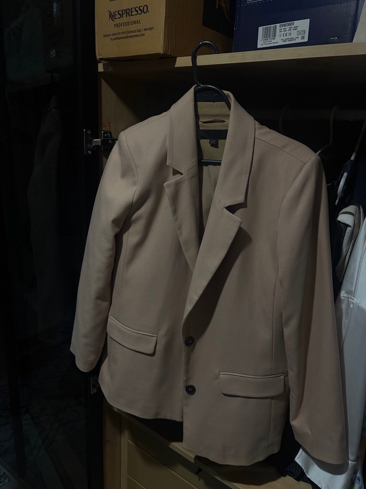 Bej renkli, düğmeli ve kesik yaka detaylı kadın blazer. Uzun kollu, düz desensiz ve ofis için uygun regular fit.