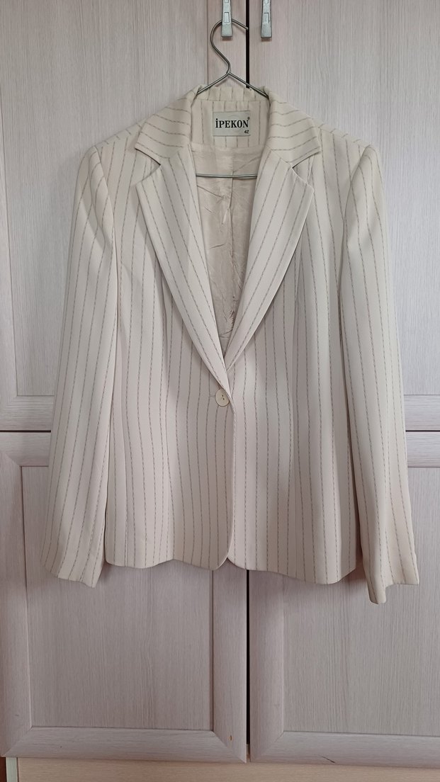 Bej pamuk kumaştan, düğmeli, uzun kollu, klasik kesim kadın blazer ceket. Ofis için modern klasik tarz sunar. Marka: IPEKON.