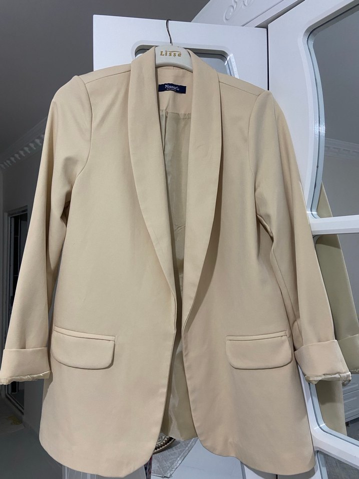 Bej renkli, uzun kollu, düğmeli kadın blazer ceket. Normal kesim ve midi boyda, ofis ve günlük kullanım için uygundur.