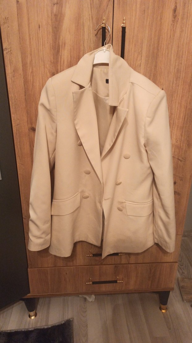 Bej renkte, düğmeli, normal kesim ve midi uzunlukta kadın blazer ceket. Uzun kollu ve yakası kesik, sentetik kumaştan üretilmiş, ofis için uygun.