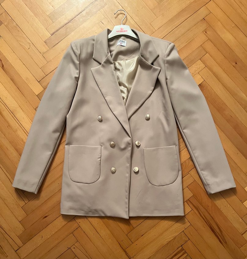 Bej renkli kadın blazer ceket, düğmeli ve kesimli yakaya sahiptir. Regular fit ve kısa boydadır, sentetik kumaştan üretilmiştir. Ofis için uygun, trend sokak stili dokunuşlu.
