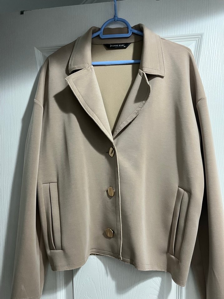 Bej renkli, düğmeli, kesik yaka ve uzun kollu kadın blazer. Sentetik kumaştan bi kere giyildi sadece tertemiz sadece etek ucu kısmında bi sıkıntı var bir de bazı yerlerde telası gözüküyor ondan ziyade sıkıntısı yok