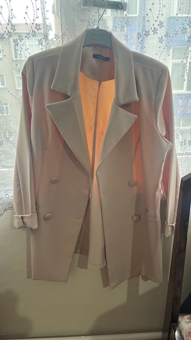 Bej renkli, düğmeli, uzun kollu kadın blazer ceket. Normal uzunlukta, regular fit, ofis ve günlük kullanıma uygundur. Sentetik kumaştan üretilmiştir. 38 beden