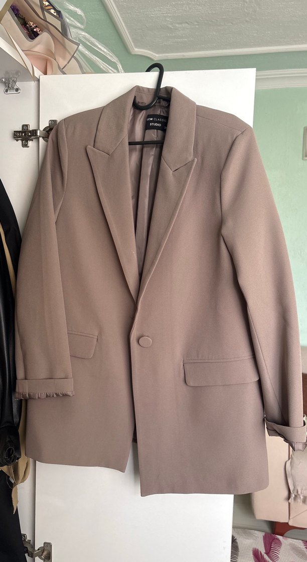 Bej renkli, düğmeli ve uzun kollu kadın blazer. Normal kesim ve midi boyda, sentetik kumaştan üretilmiştir. Ofis kullanımı için uygundur.