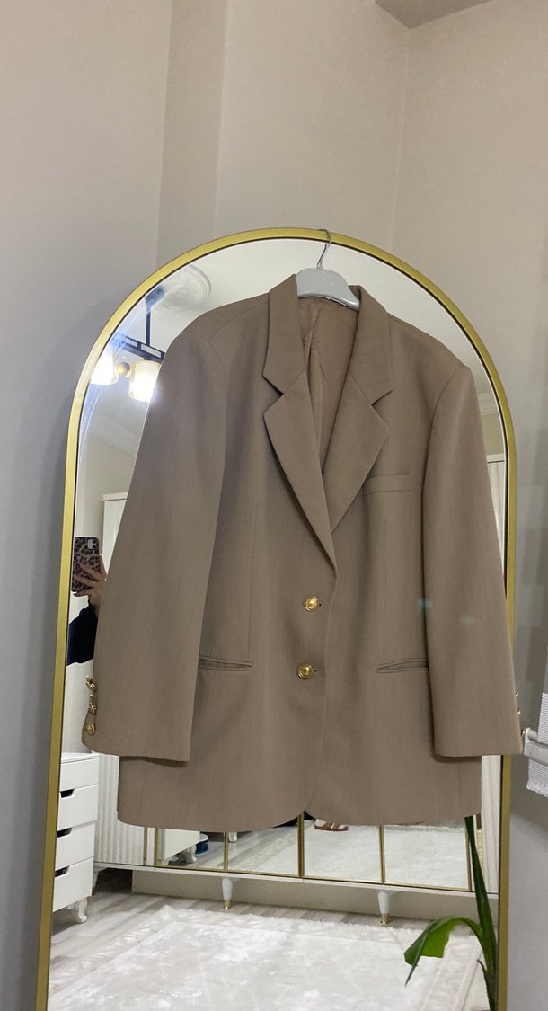 Bej renkte, düğmeli ve kesik yakalı kadın blazer ceket. Uzun kollu, normal kesim ve ipeksi dokusuyla ofis için uygundur. ✨