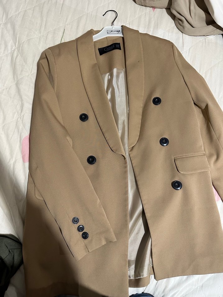 Bej renk, düğmeli ve uzun kollu kadın blazer ceket. Normal boy ve rahat kesime sahip, iş veya gündelik kullanıma uygun. Sayılı giyildi defosuz