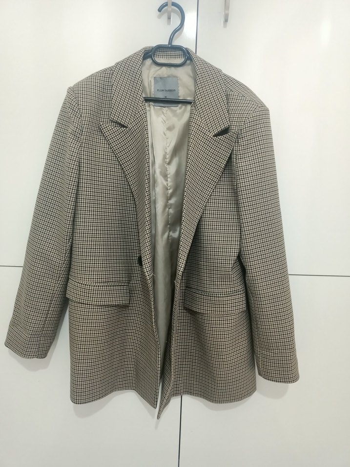 Düğmeli, bej tonunda, sentetik kumaştan yapılmış kadın blazer ceket. Uzun kollu, normal kesim ve Paris sokak tarzı etkisiyle ofis için uygun.