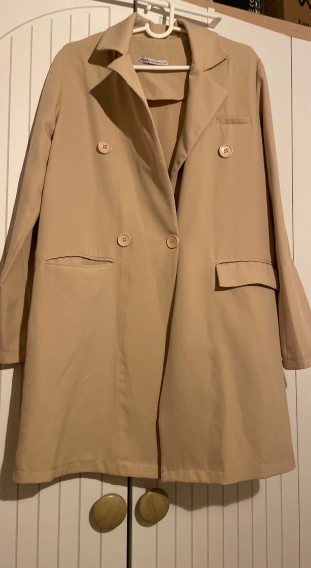 Bej renginde, uzun kesim ve düğmeli kadın blazer ceket. Uzun kollu ve regular fit, rahat sentetik kumaştan üretilmiştir.