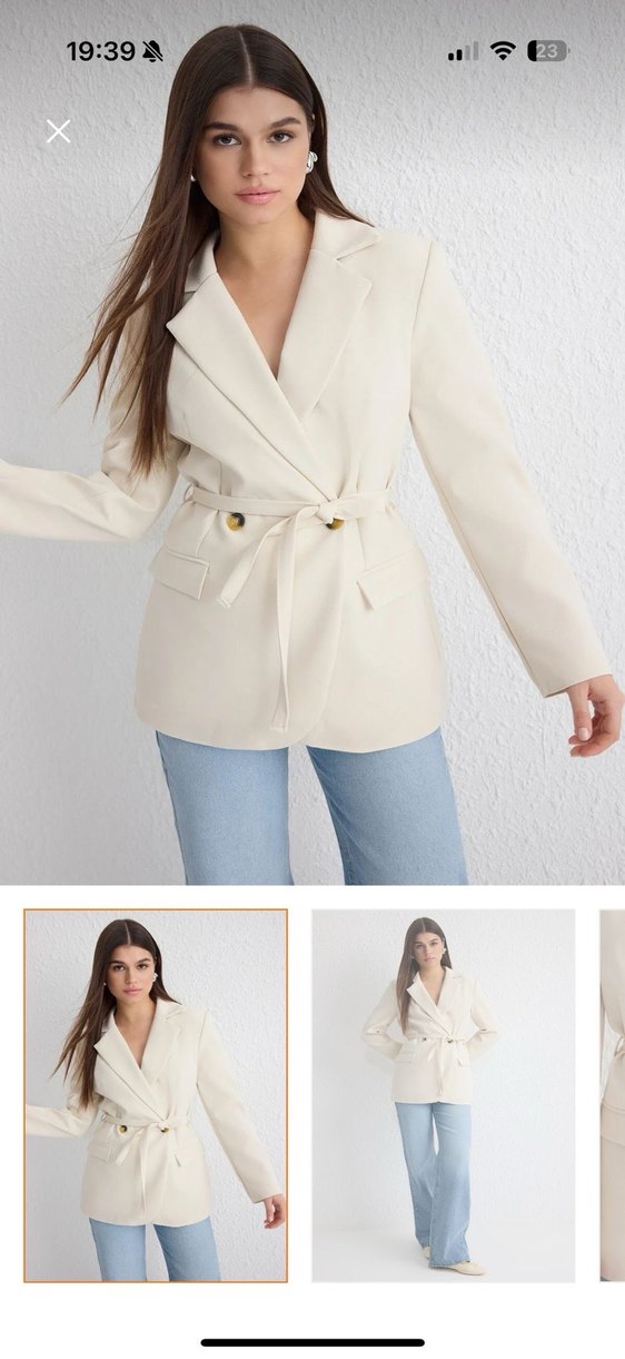 Bej renkli, düğmeli ve kemerli kadın blazer ceket. Normal uzunlukta ve regular fit olup, ofis ve günlük şıklık için uygundur. Sentetik kumaştan üretilmiştir.ekru renkte ve kesin alicak kisiye diyatta indirim yapilir