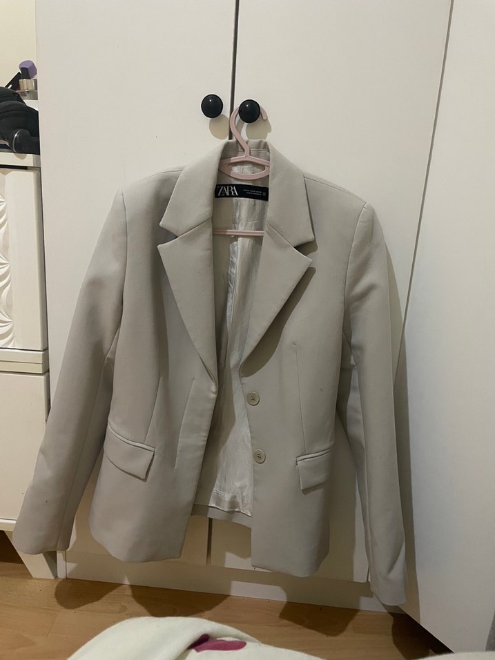 Bej renkte, düğmeli ve klasik kesim uzun kollu kadın blazer ceket. Ofis ve günlük şıklık için uygundur.