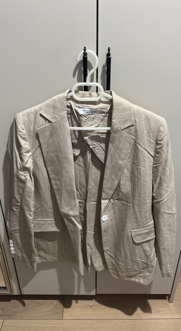 Bej renkli, düğmeli, keten kumaştan kadın blazer ceket. Uzun kollu, normal kesim, ofis ve günlük kullanım için uygundur.