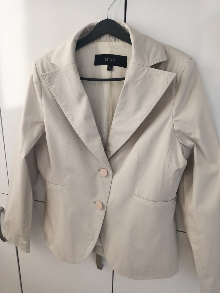 Bej düğmeli, keten kumaştan kadın blazer ceket. Notlu yaka, uzun kollu ve regular fit. Ofis ve günlük kullanıma uygun, desen içermeyen midi boy. pantolonlu takım kusursuzdur.