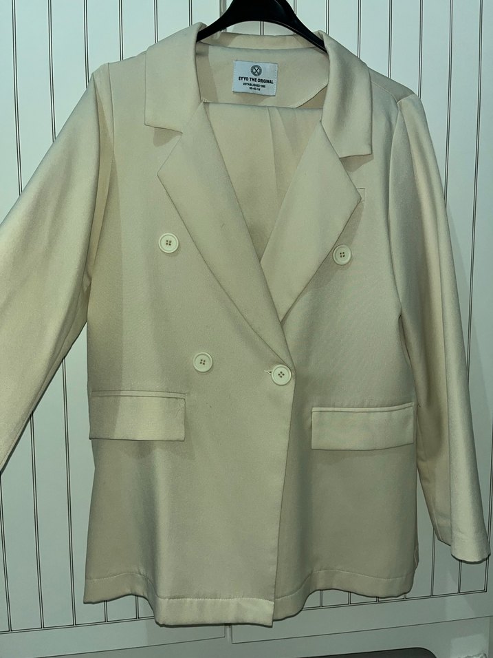 Bej renkte, düğmeli, uzun kollu kadın blazer ceket. Ipeksi kumaştan, normal uzunlukta ve klasik şıklık için uygun. Sadece bir kere giyildi.