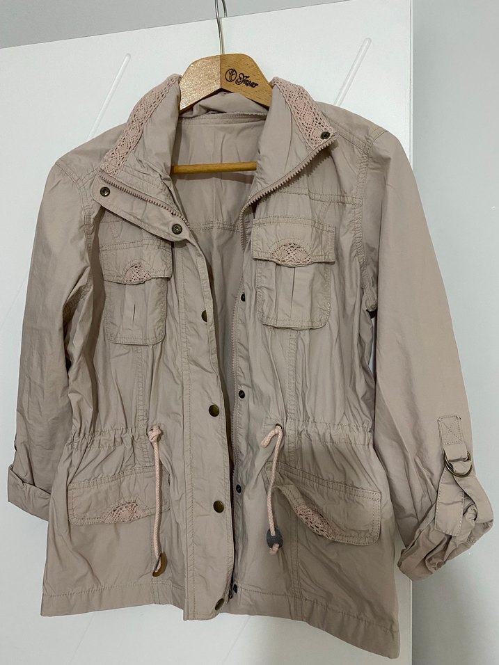 Bej renkli, düğmeli, bol kesim kadın ceket. Uzun kollu ve keten kumaştan, günlük dış mekan kullanımı için uygundur.