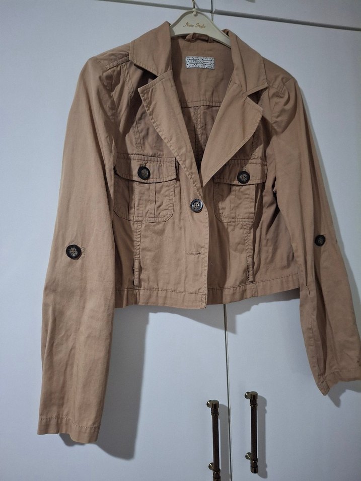düğmeli kadın ceket, kesik yaka ve uzun kollu. Keten kumaştan, rahat kesim ve günlük sokak stili için uygundur.