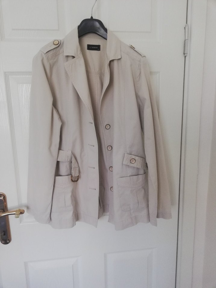 Bej ceket, düğmeli ve kesik yakalı, uzun kollu ve normal kesimdir. Ofis ve günlük sokak stili için uygundur. Lcwaikiki 40 beden. Ürünlerim fotoğraflandıktan sonra asla kullanılmıyor.