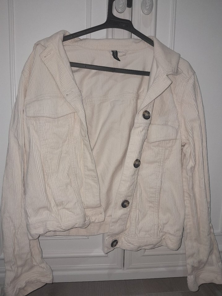Bej düğmeli kadın ceket, uzun kollu ve kırmalı yaka detaylıdır. Yumuşak keten kumaştan yapılmış, bol kesim ve midi boydadır. h&m