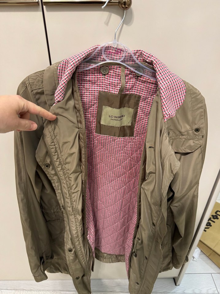 Bej renkte, düğmeli ve uzun kollu kadın ceketi. Normal kesim ve kırmızı kareli iç astar ile günlük kullanıma uygundur.