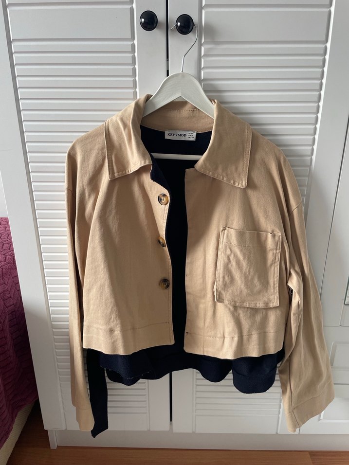 Bej keten kumaştan, düğmeli, ve cep detaylı, bol kesim kadın ceket. Arka kısmı kaşe.