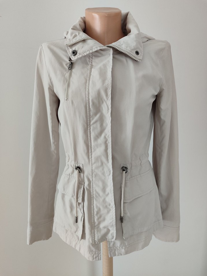 Bej renkte, düğmeli, notlu yakalı kadın ceketi. Normal kesim ve midi boyda, sentetik kumaştan üretilmiştir. Sokak tarzı için uygun.