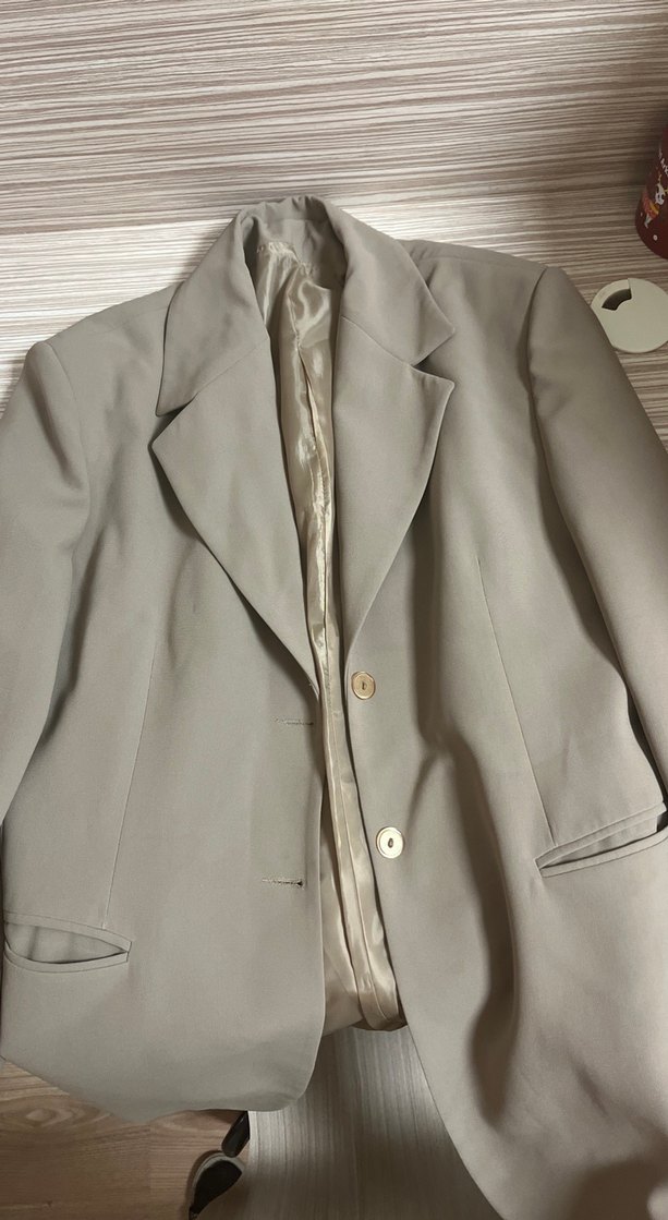 Bej renkli, düğmeli ve klasik yaka kadın ceketi. Normal kesim ve uzun kolludur, ofis ortamına uygundur.