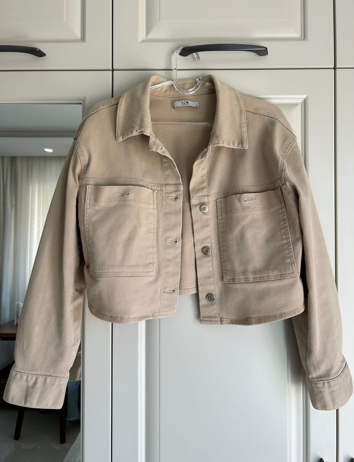 Bu bej renkli kadın denim ceket, düğmeli ön kapama ve bol kesime sahiptir. Notlu yaka ve uzun kolludur, gündelik sokak stiline uygundur. Desensiz ve midi boydadır. Ufak bir leke durumu var görseli sona ekledim