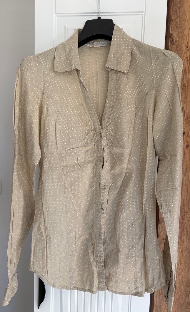 Bej pamuklu kumaştan, uzun kollu ve düğmeli ön kısmı olan kadın gömleği. Ofis kullanımı için uygun, regular kesim ve yakalıdır.