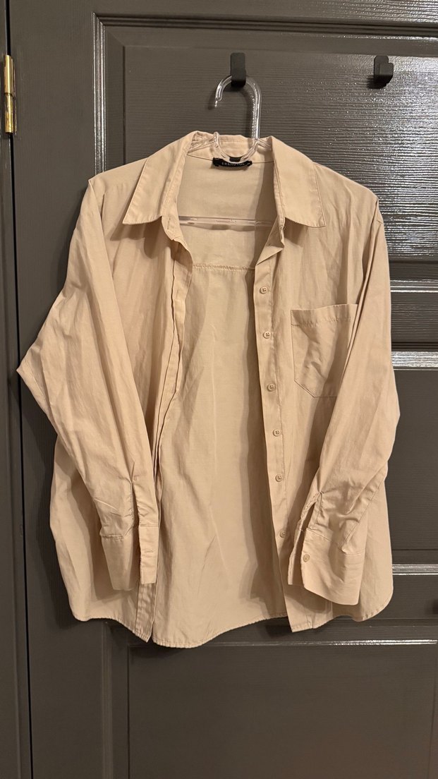 Bej renkli, uzun kollu kadın gömleği. Düğmeli, bol kesim ve çıtlıklı yakaya sahiptir. Minimalist tarzda, günlük kullanıma uygun.