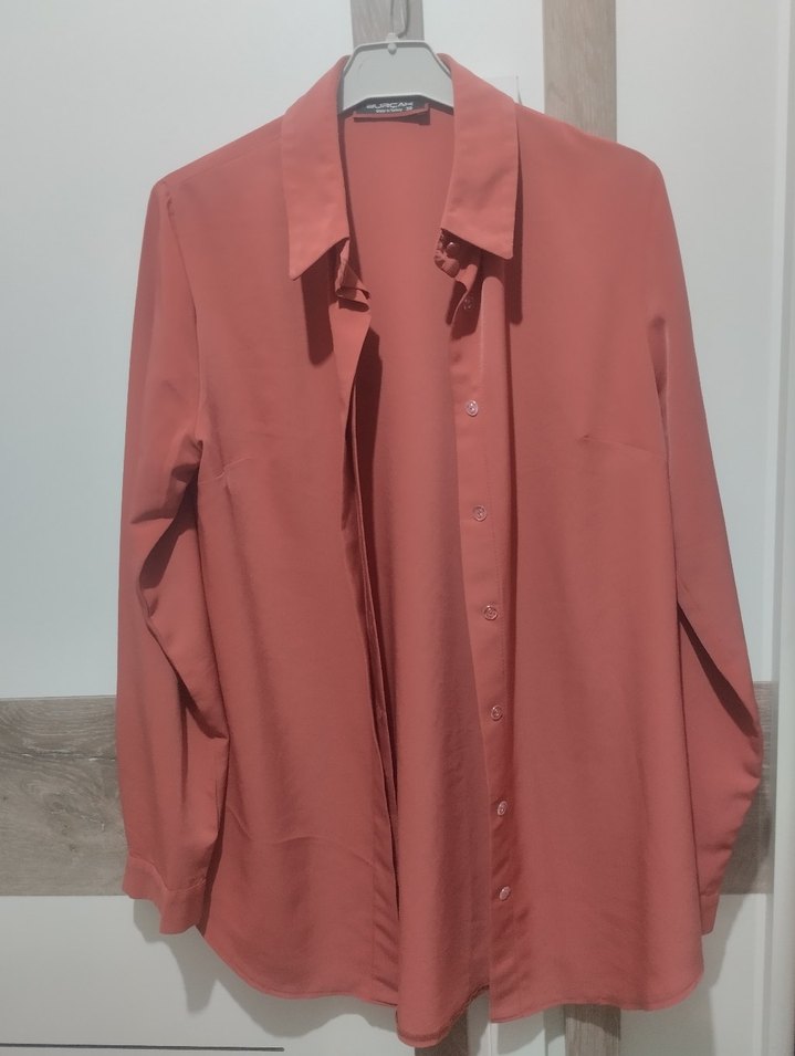 Düğmeli, uzun kollu, yakalı ve bol kesim pastel bej renkli kadın gömleği. Minimalist tasarımıyla ofis için uygundur.
