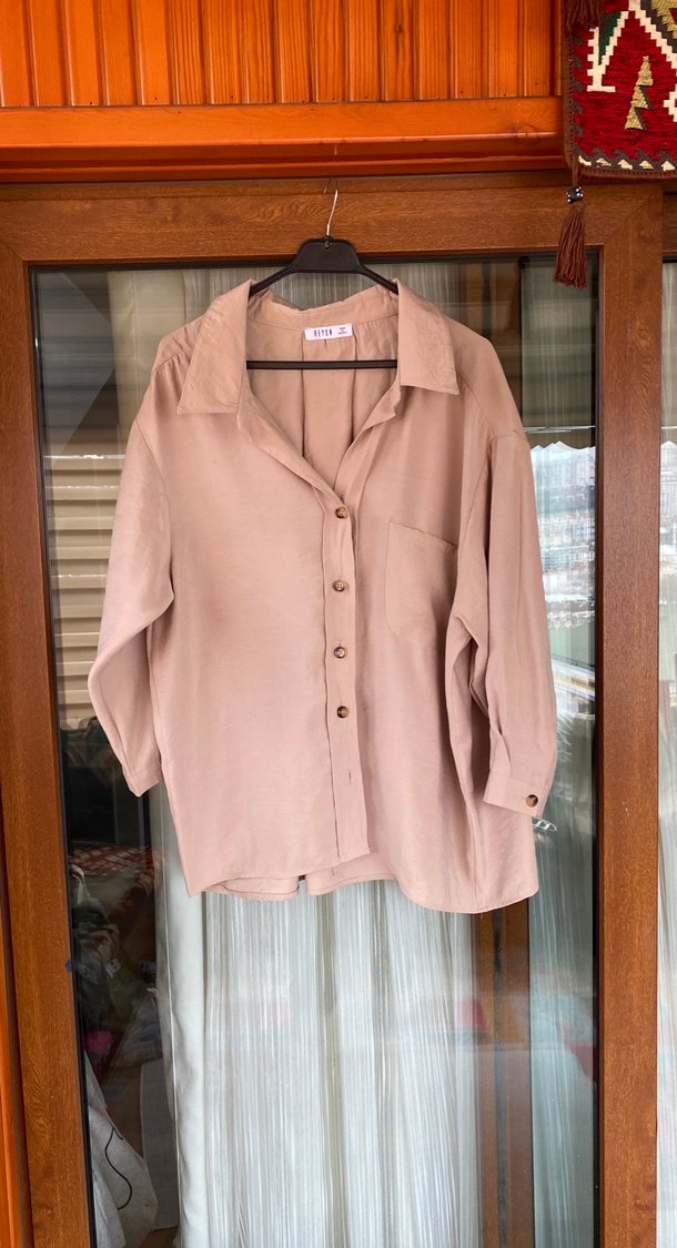 Bej gömlek, düğmeli ve kesik yaka detaylıdır. Uzun kollu, bol kesim ve midi boyda olup Paris normcore tarzını yansıtır. Günlük kullanıma uygundur.