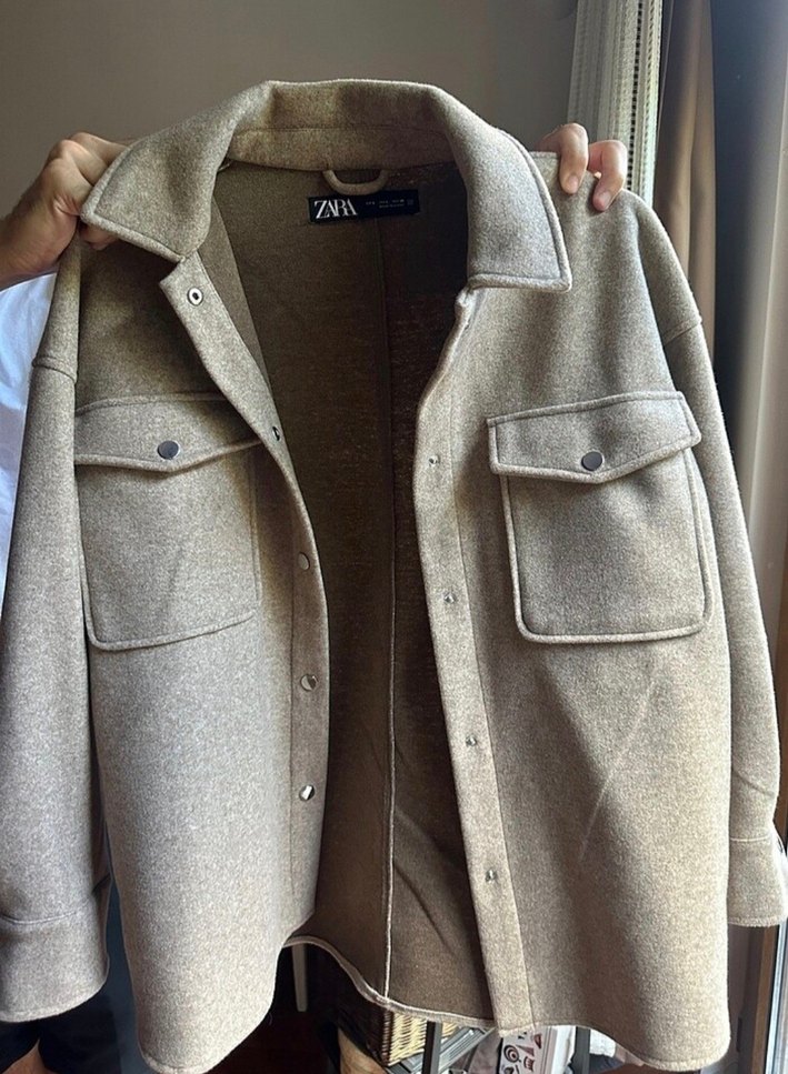 Bej renk, düğmeli, midi uzunlukta kadın gömlek ceket. Yumuşak kumaştan, uzun kollu ve bol kesim. İki kapaklı cep bulunur. Rahat sokak stili için uygundur.